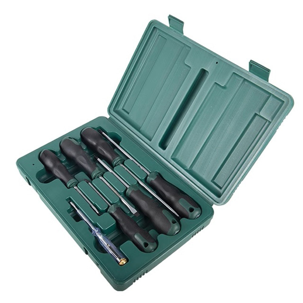 3 pieces of flathead rubber screwdrivers (5x75mm/5x100mm/6x150mm) 3 pieces of Phillips rubber screwdrivers (5x75mm/5x100mm/6x150mm) 1 piece of 100V-500V test pen Made of S2 alloy steel, high hardness, wear-resistant, and not easily damaged. PP premium engineering plastic handle, comfortable grip, long lifespan, and does not slip when sweaty. Comes with PP plastic case, the slots are more gentle and do not easily fall out.